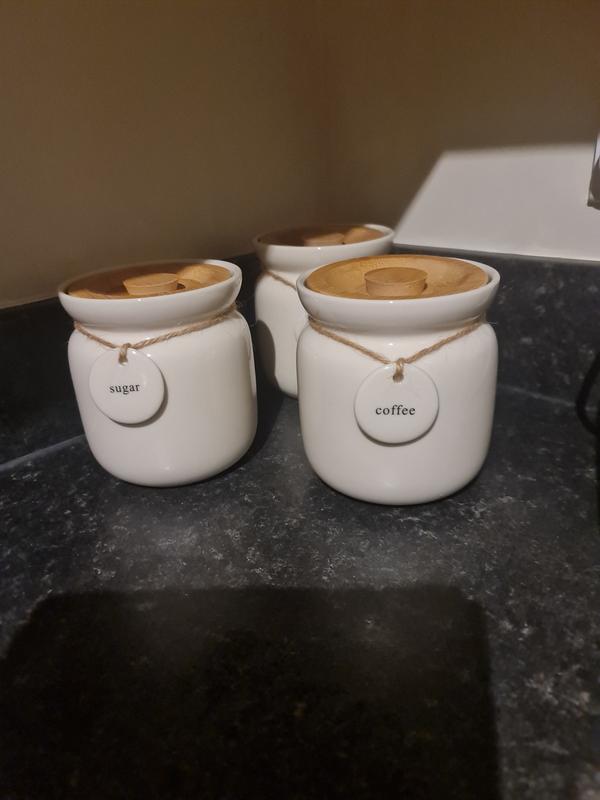 Bloomingtons Direct Set of 3 Kitchen Canisters Tea Coffee Sugar Ceramic Canisters with Pendent Labels and Wooden Top Lid Stackable Kitchen Storage Very well made.
