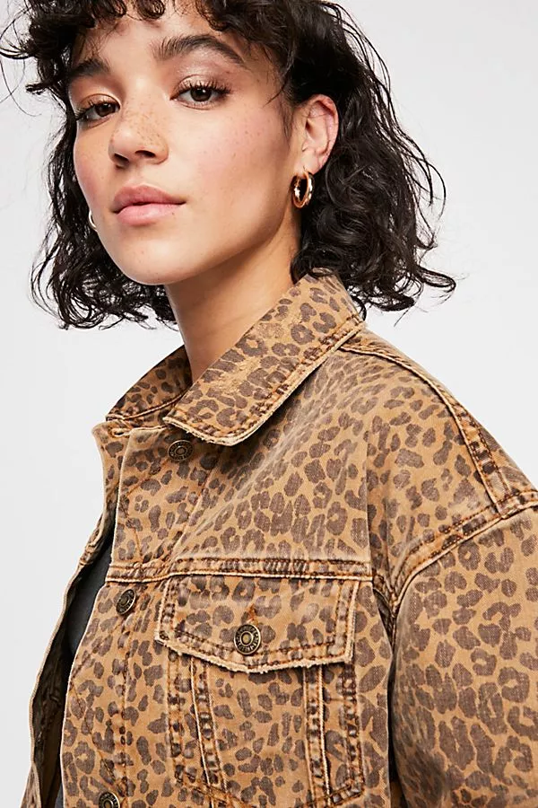 Free People Denim Jacket Size Medium Cheetah Print 100 Cotton Very well made.
